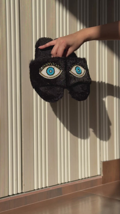Add a touch of charm and comfort to your everyday lounging with our Evil Eye Furry Slides And LOVE charm. Designed with ultra-soft vegan faux fur, these slippers are not just irresistibly cozy but also carry a hint of good luck and protection with their signature hand-beaded Evil Eye motif.